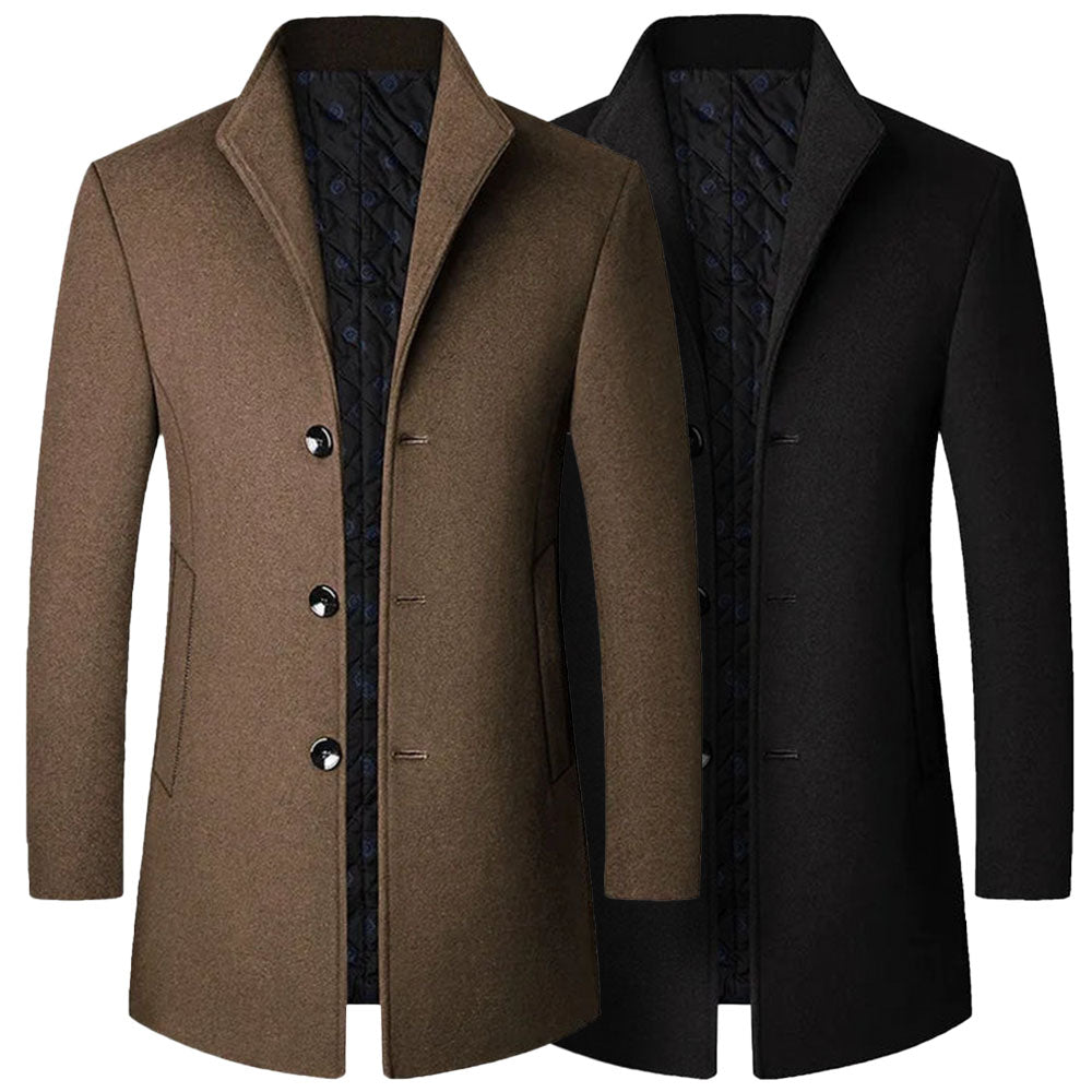 Statement of power dressing, this structured long coat boasts a sharp, tailored silhouette with a high-collar design and sleek button closure. Its premium inner lining adds warmth and sophistication, making it a perfect choice for elevating winter ensembles with timeless charm.