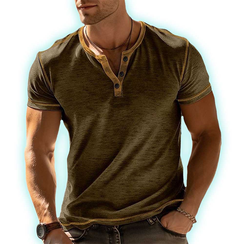 The classic buttoned Henley collar introduces a touch of timeless sophistication to the everyday look.