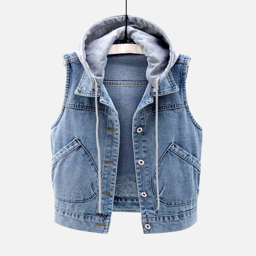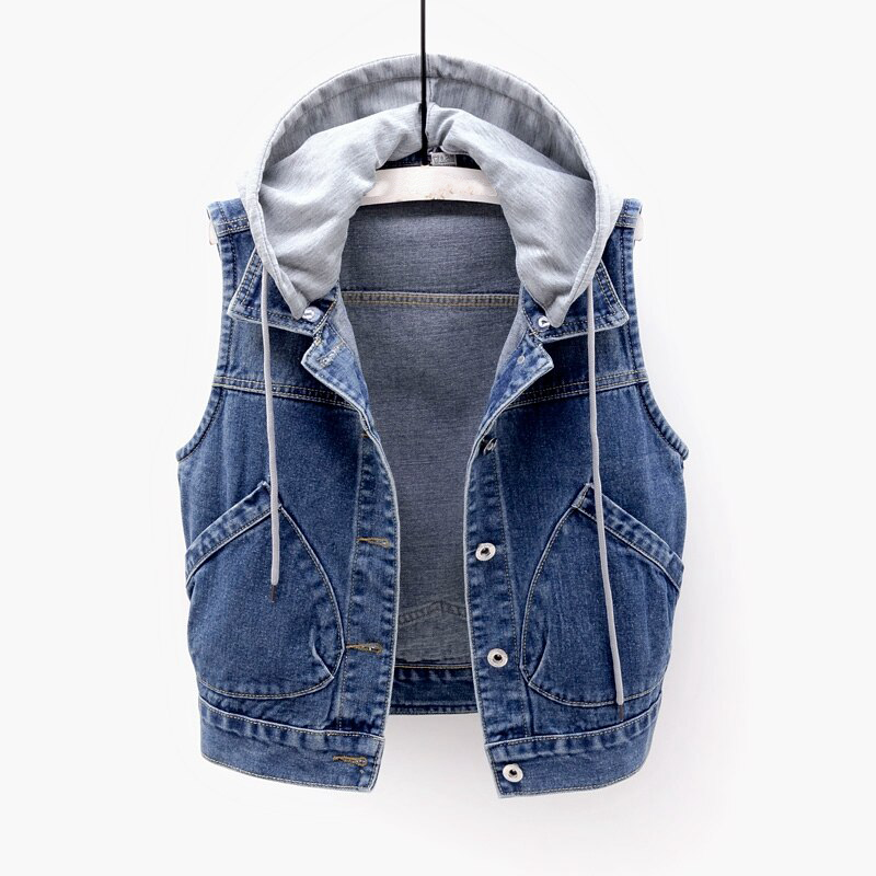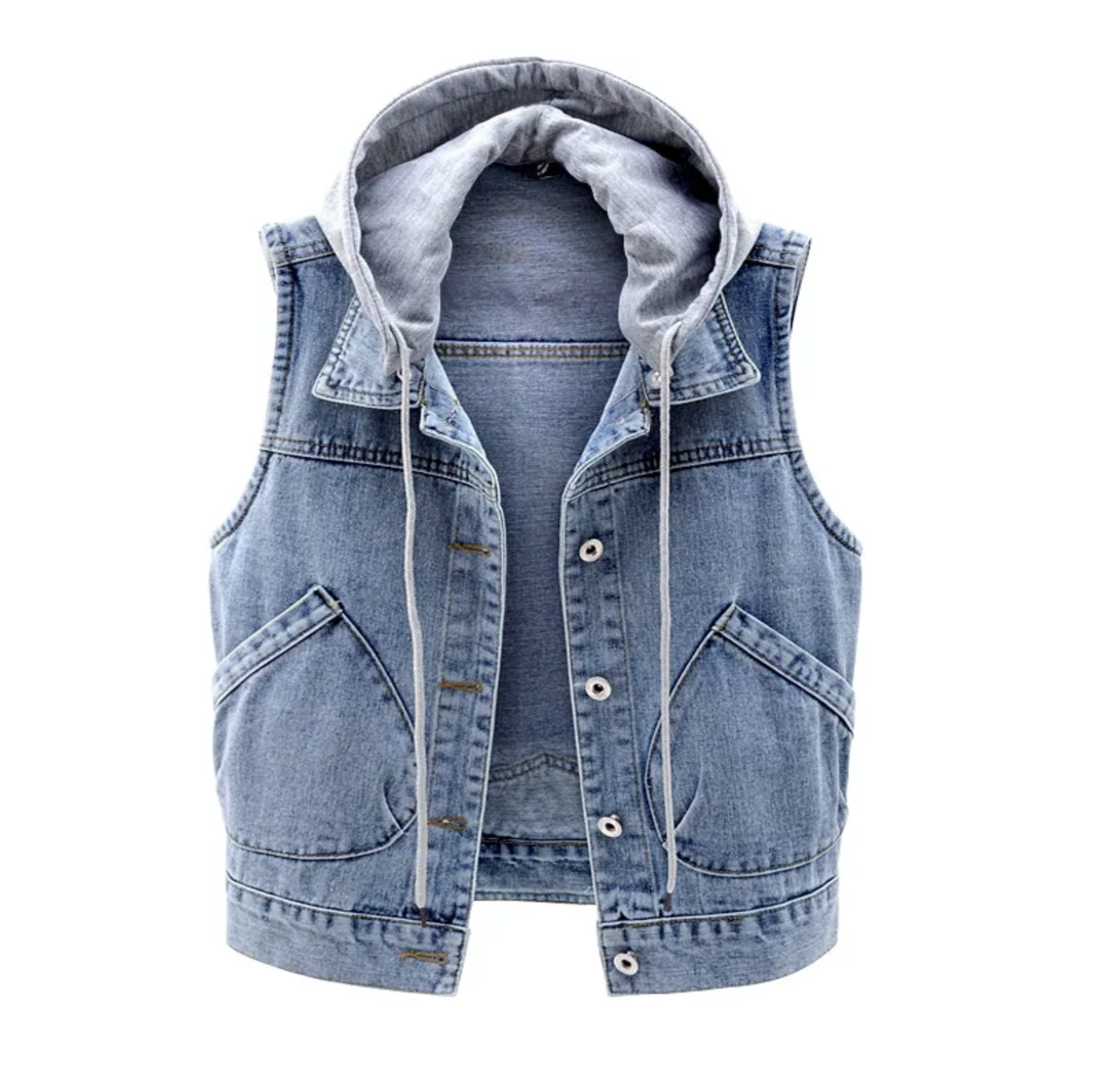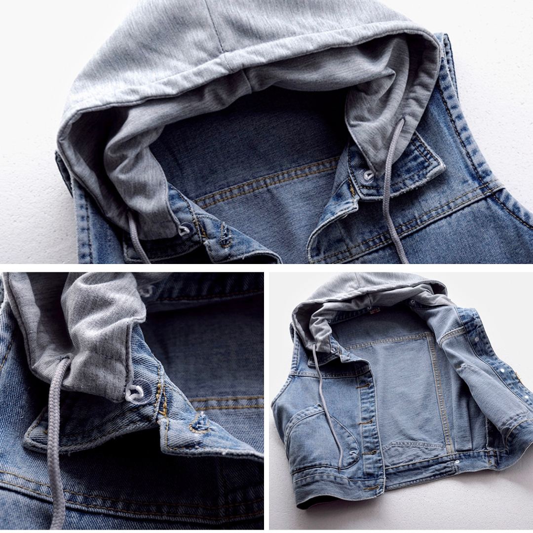 Boasting a turn-down collar neckline, detachable hood, and a slim, classic blue silhouette, this timeless denim vest breathes new life into a wardrobe essential.