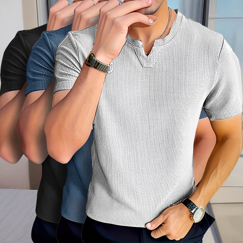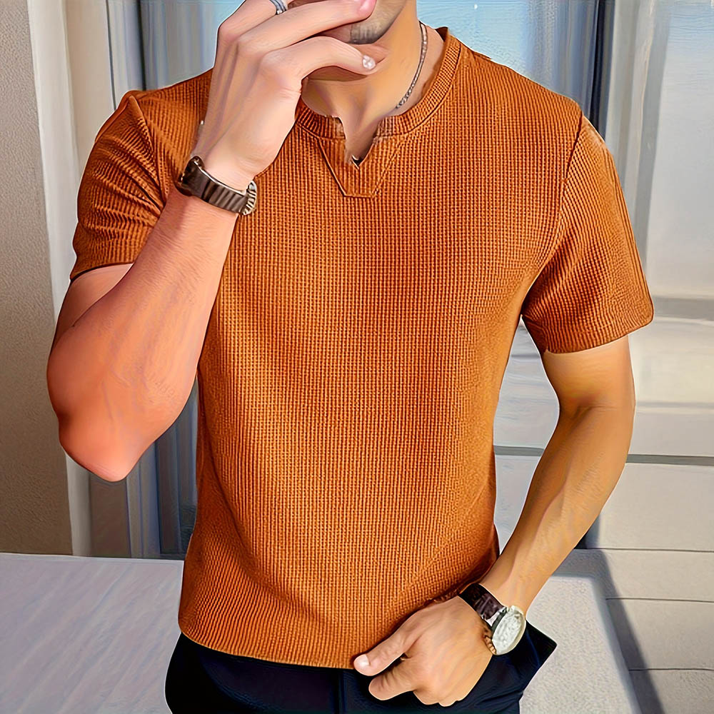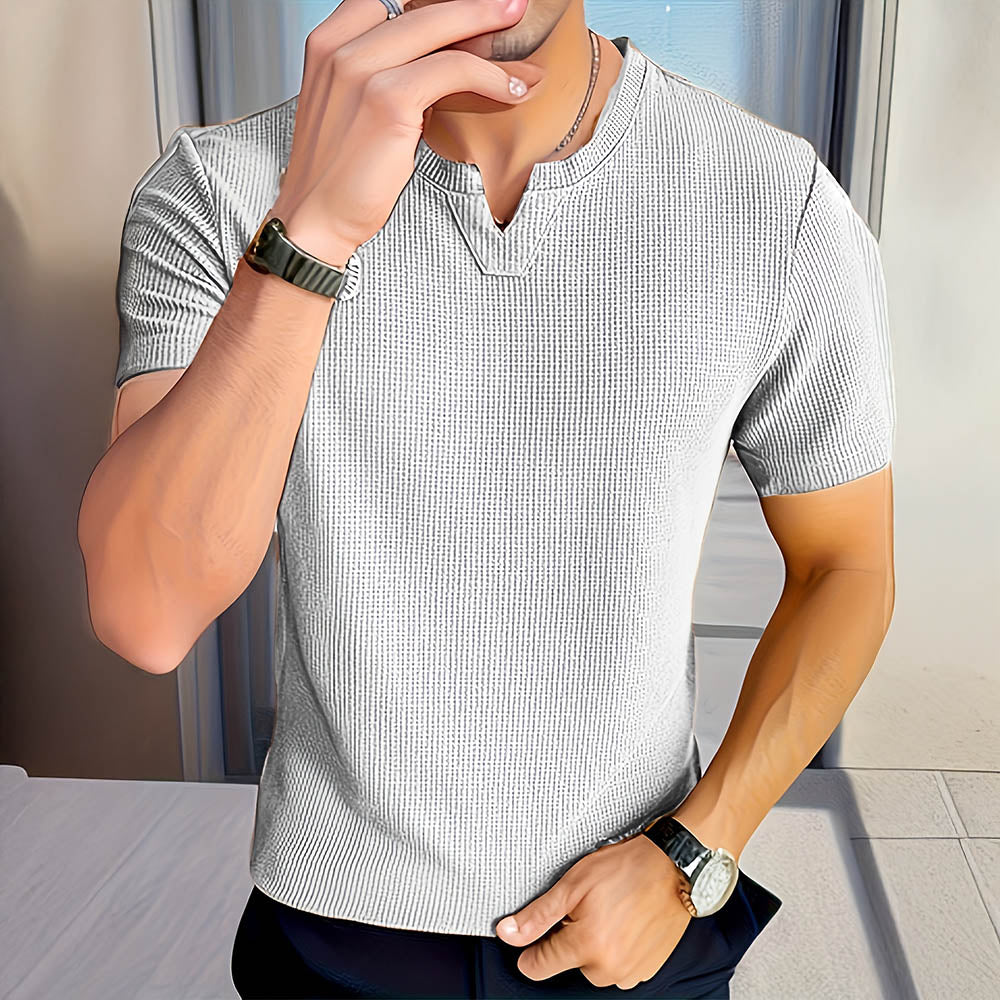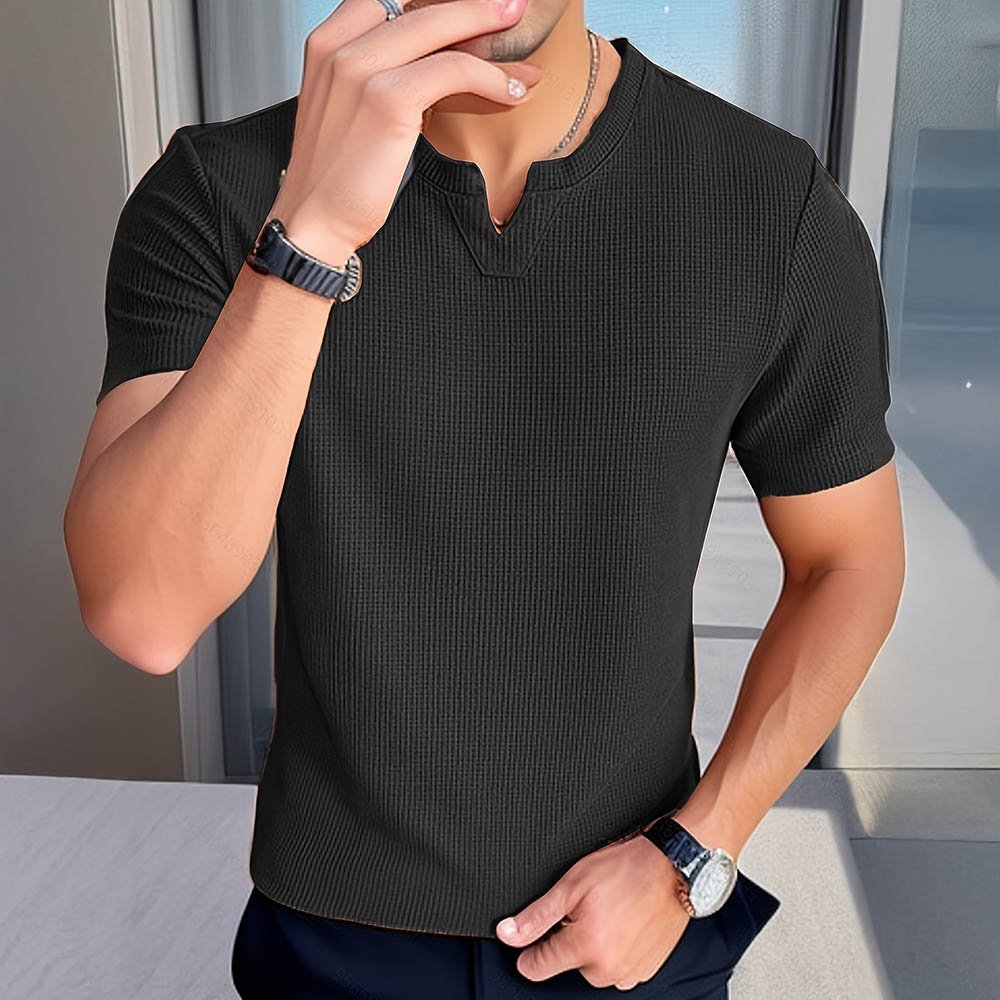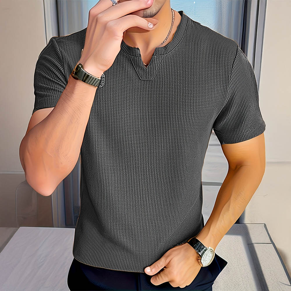 Structured with subtle texture and finished with a clean split neckline, this waffle-knit tee delivers a refined yet relaxed feel balancing laid-back energy with modern polish making it an easy essential for days that call for quiet confidence.