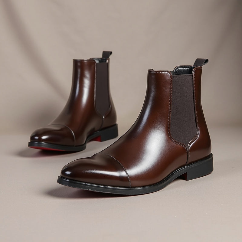 Crafted from premium hand-finished leather, this Chelsea boot embodies refined sophistication with its sleek cap-toe and polished silhouette. Elastic side panels ensure effortless wear, while the meticulously constructed sole delivers lasting comfort and durability. A statement of understated luxury and modern craftsmanship.