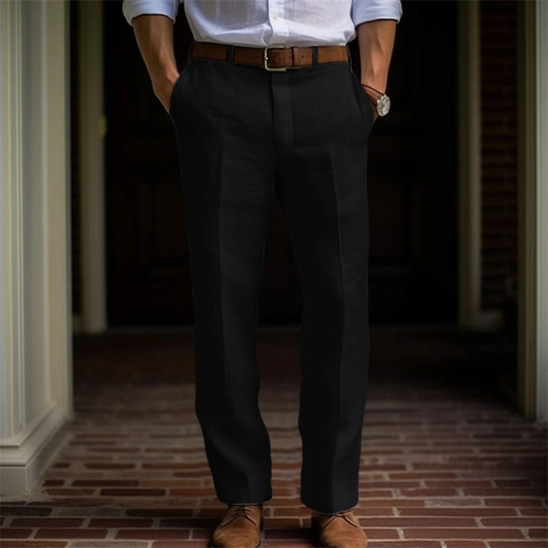 Thoughtfully cut from breathabl linen blend, these trousers are tailored with crisp front seams and a straight drape that embodies understated refinement. The breathable fabric ensures comfort in every season while maintaining a polished, timeless appeal.