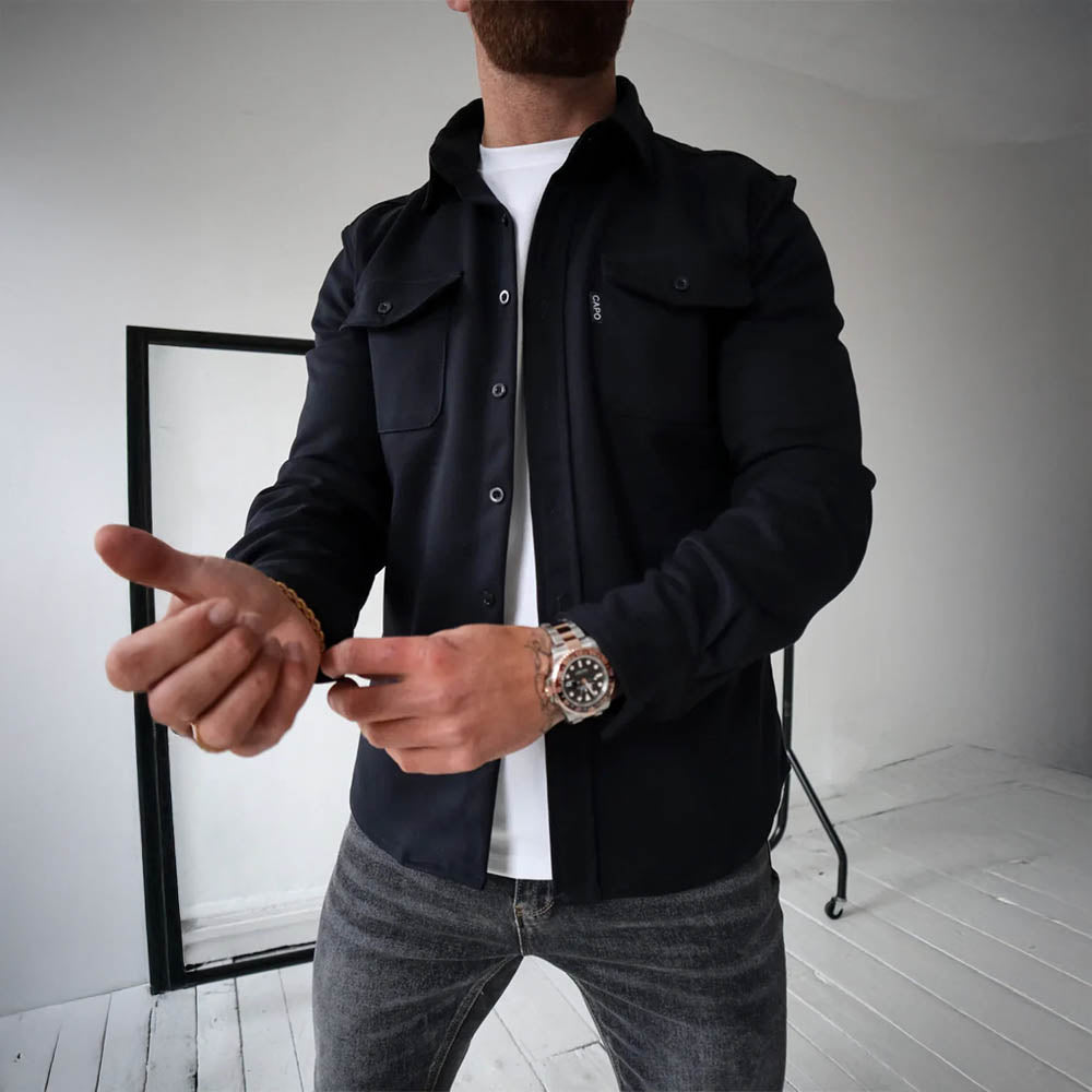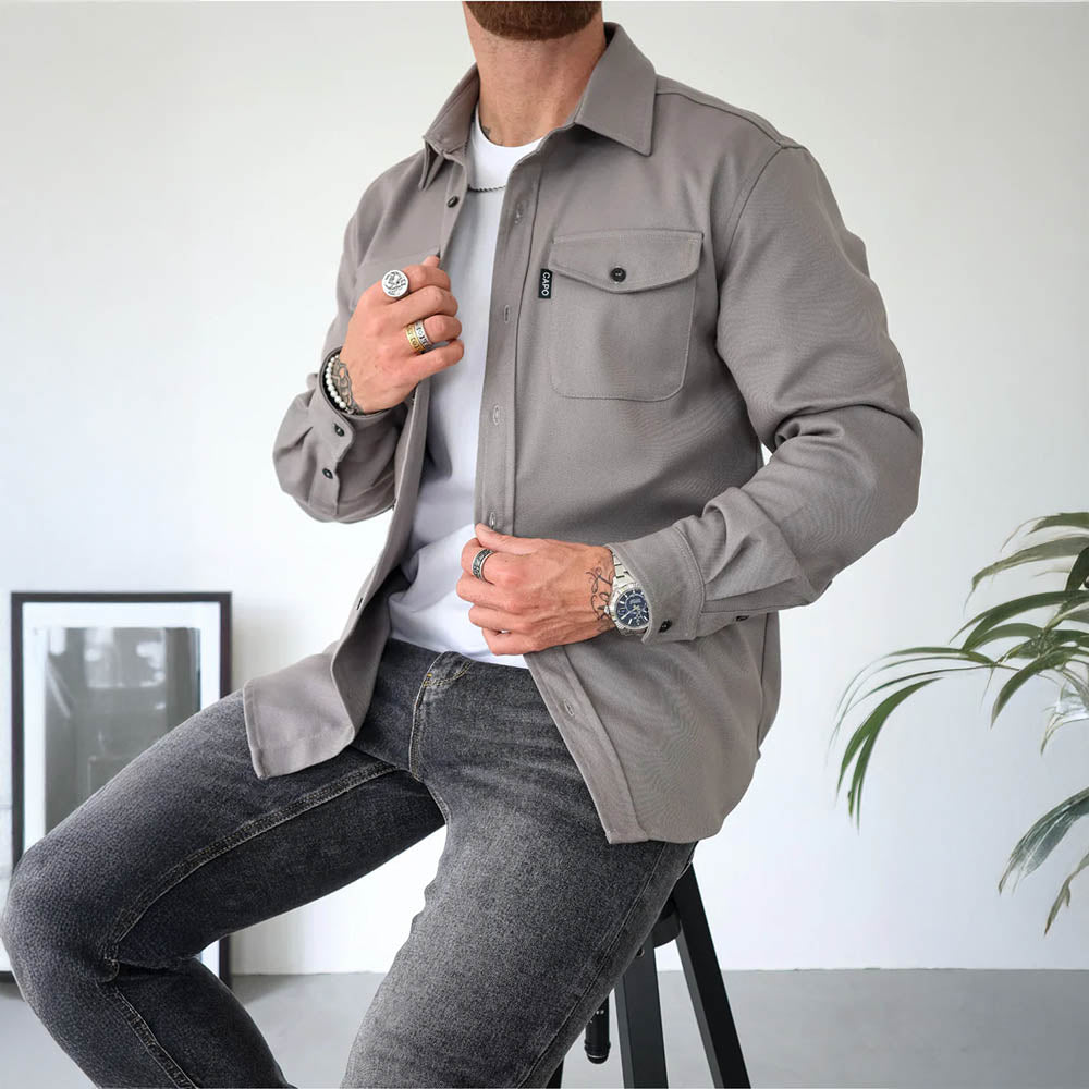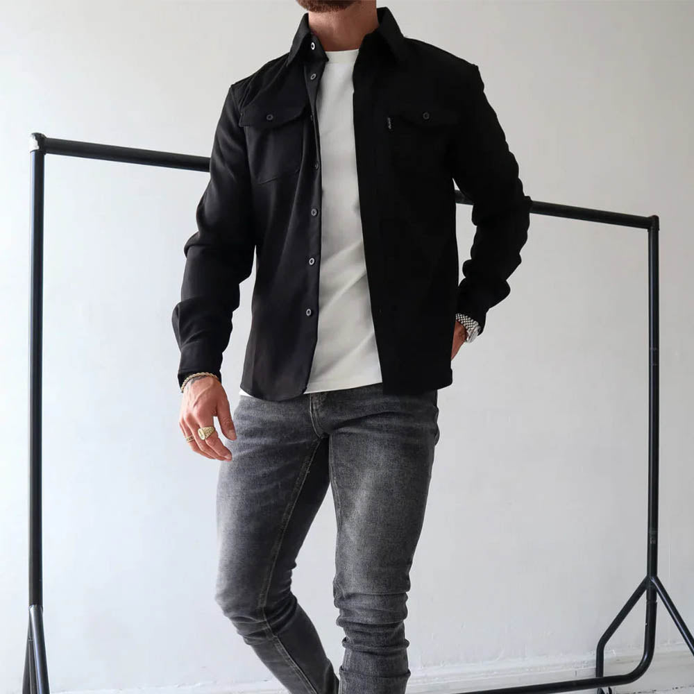 Tailored from an ultra-premium fabric blend, this handsome shirt delivers a structured yet relaxed silhouette that transitions seamlessly from day to night. With its sharp collar, utility-style chest pockets, and effortlessly refined finish, it’s the perfect blend of modern minimalism and everyday sophistication.