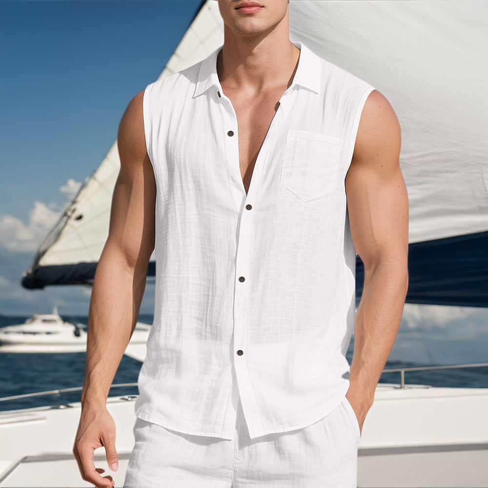 Hand crafted from airy linen and tailored for coastal ease, this sleeveless button-down is crafted to channel effortless refinement. The clean-cut collar, tonal chest pocket, and flowy silhouette evoke barefoot luxury, perfect for sunlit sails or seaside lounging. Cool, crisp, and confidently minimal.