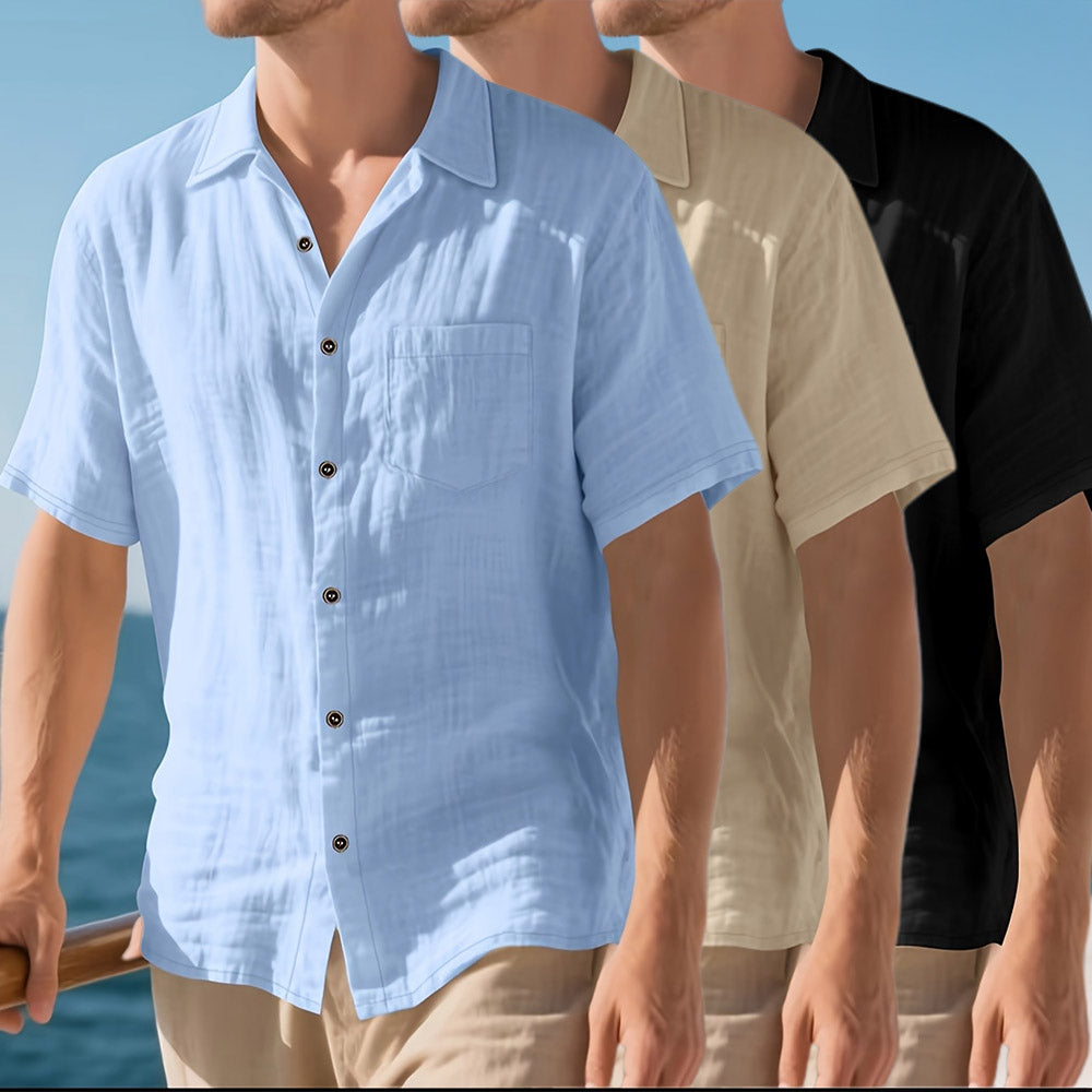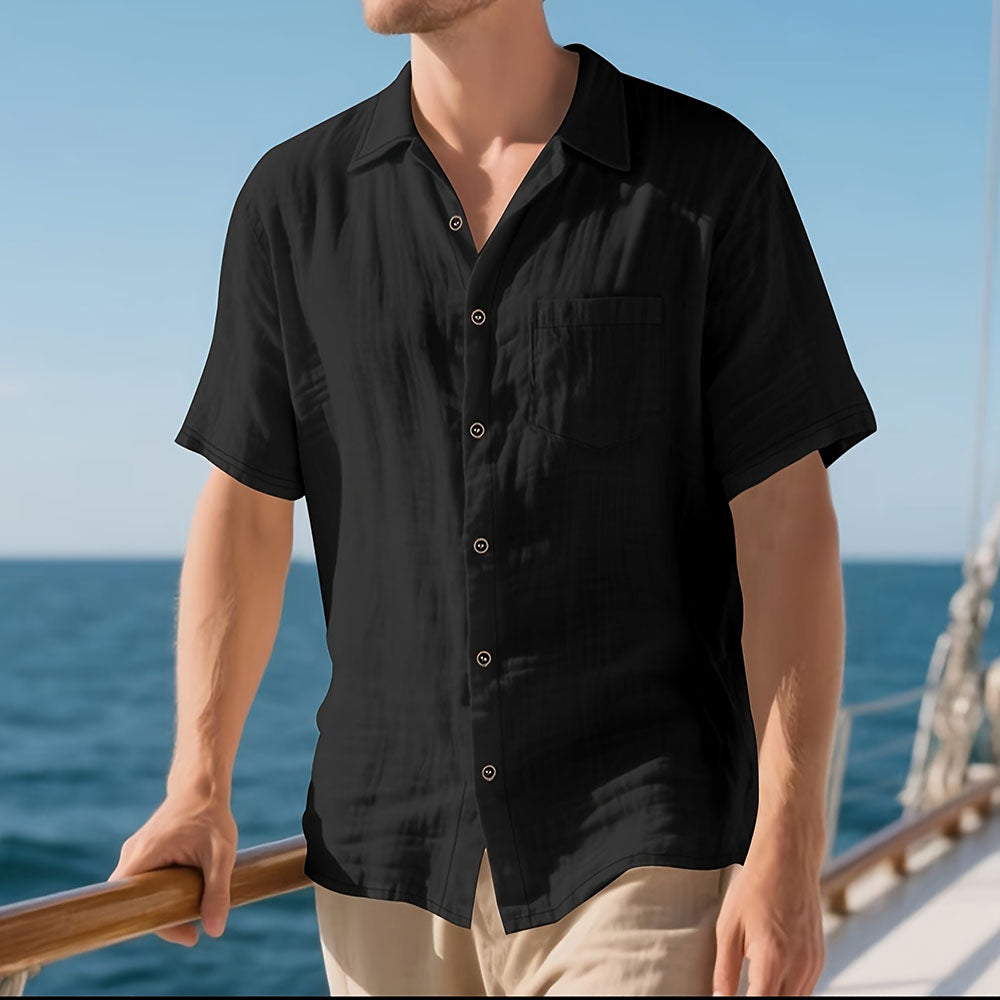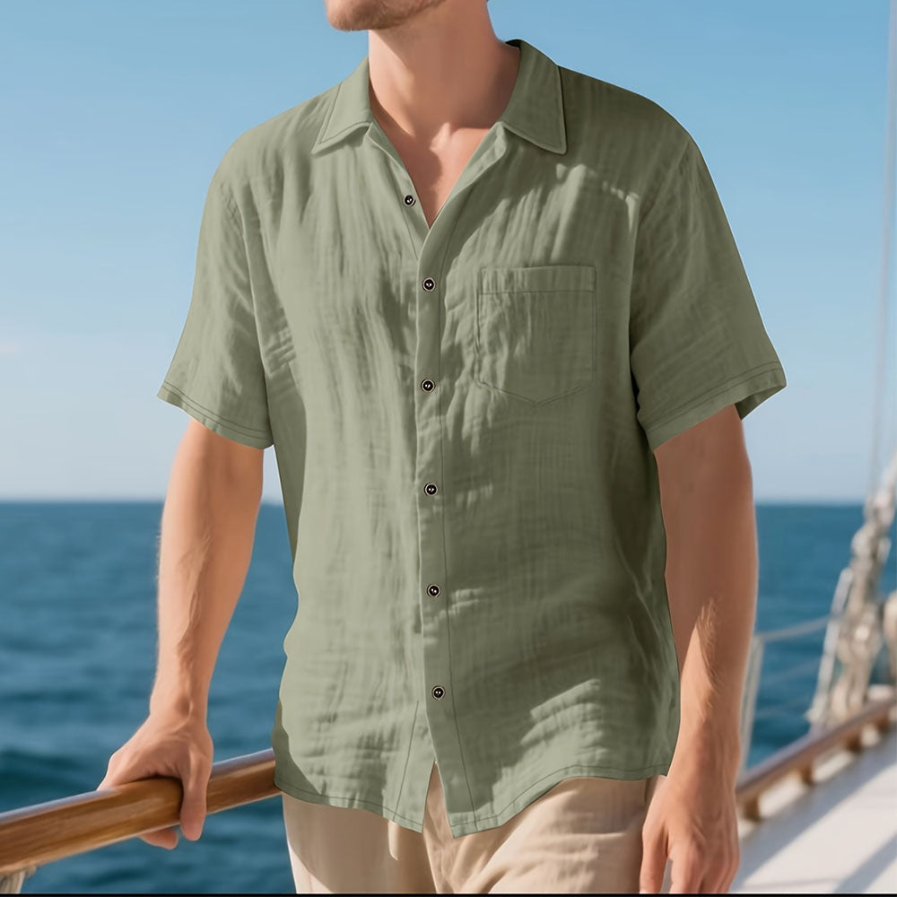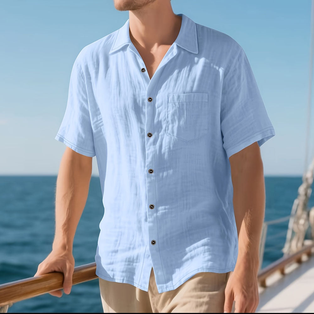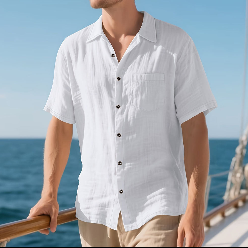 Tailored from a lightweight, breathable fabric, this handsome short sleeve shirt brings effortless sophistication to summer styling. The sharp collar, chest pocket, and contrast buttons deliver a coastal-inspired, polished finish. Ideal for leisure days on deck or smart casual outings.