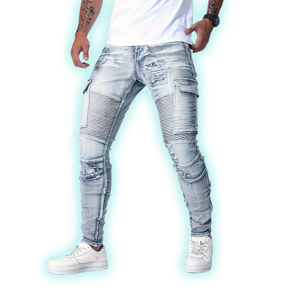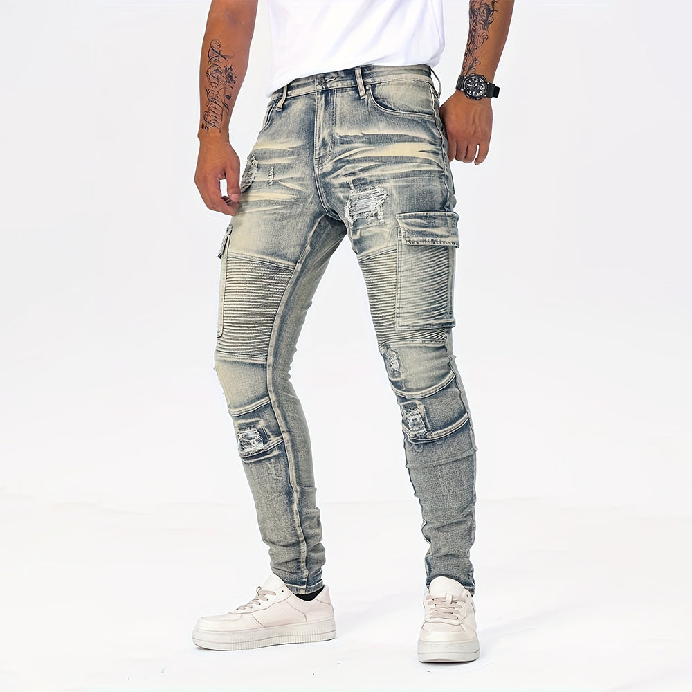 Urban edge meets casual comfort in these distressed, moto-style jeans. Textured knee panels and cargo pockets add a rugged flair, perfect for a bold, street-smart look. Elevate any outfit with these slim-fit, washed denim essentials.