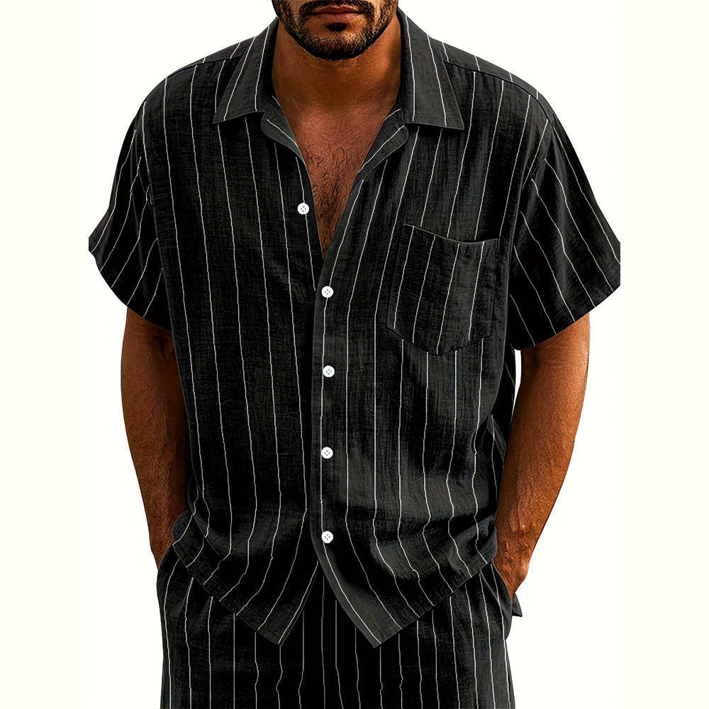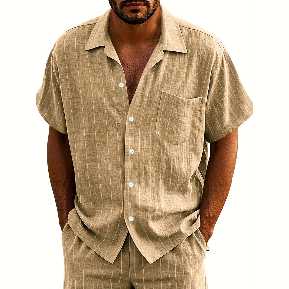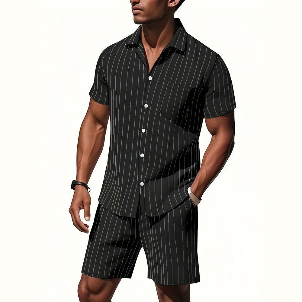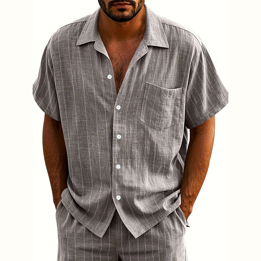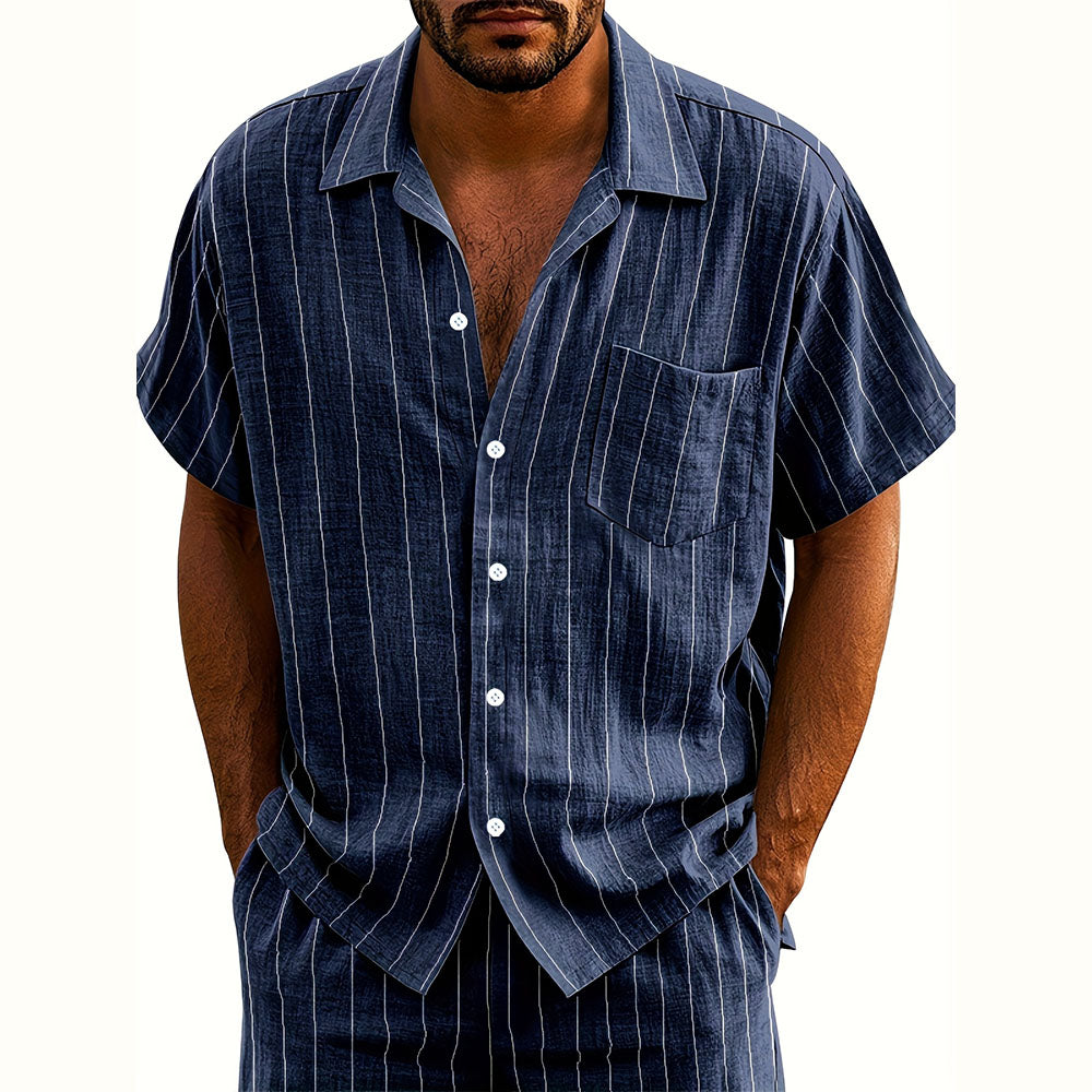 Crafted from breathable linen, this co-ord set delivers laid-back ease with tailored elegance. The shirt features a relaxed camp collar, dropped shoulders, and a secure button-front for effortless wear. Finished with subtle pinstripes and matching shorts, it blends comfort with thoughtful design built for warm days.