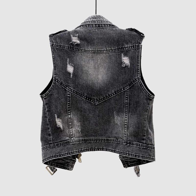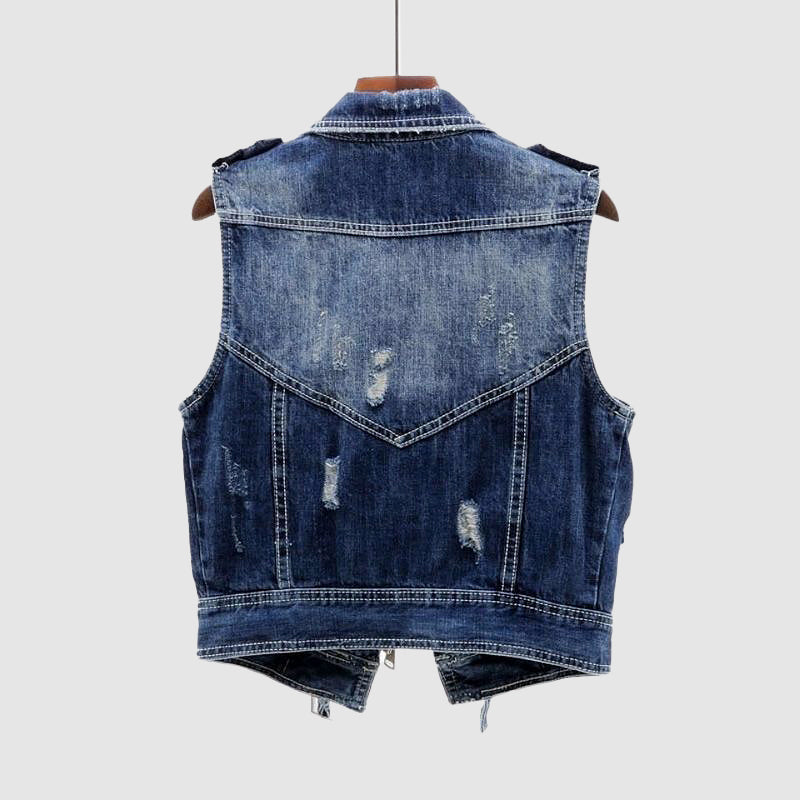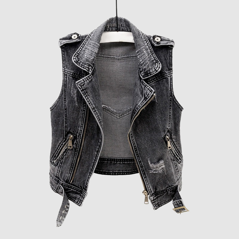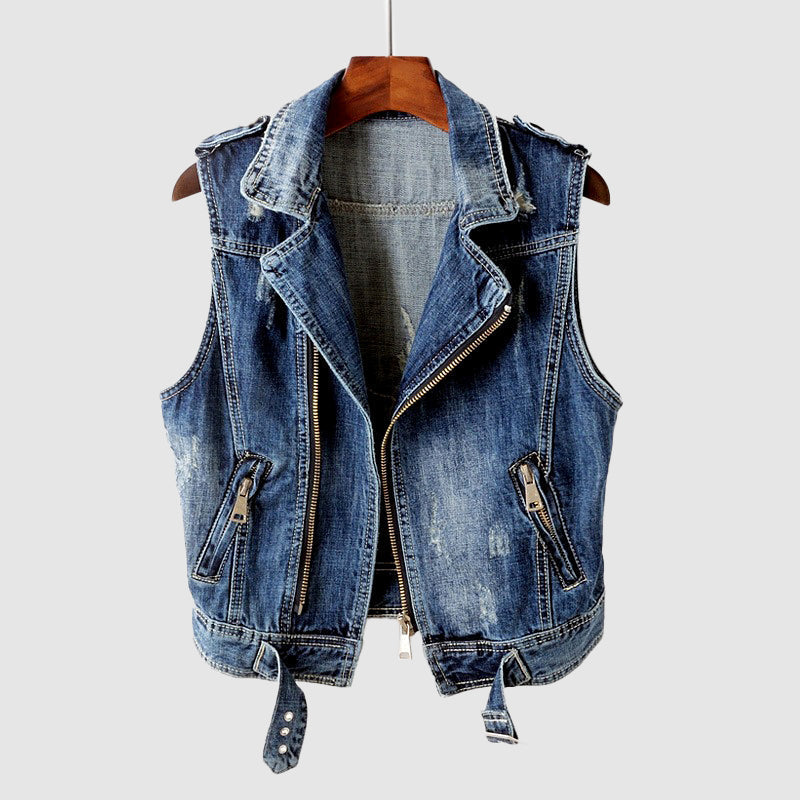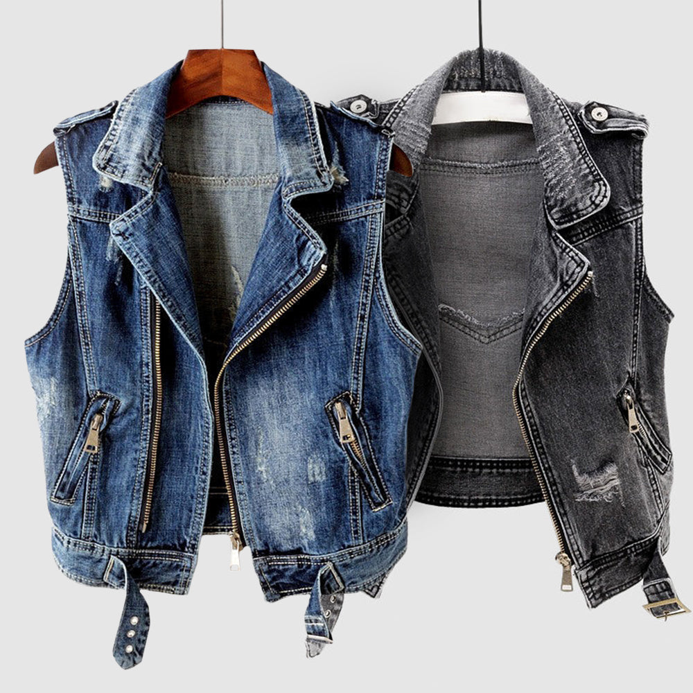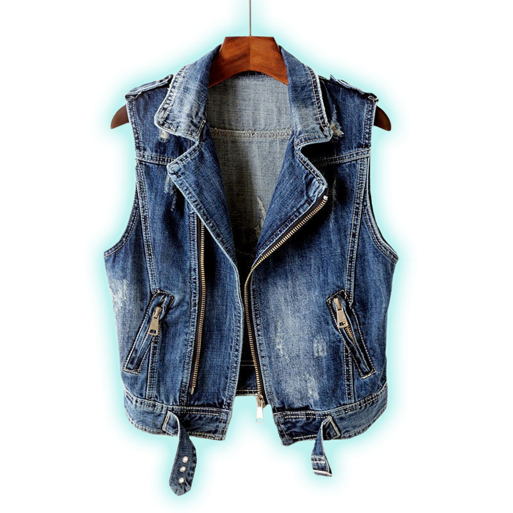 Crafted from Luxuriously soft cotton denim, the vest boasts a zipper down front, a belted waistline, and classic zip pockets.