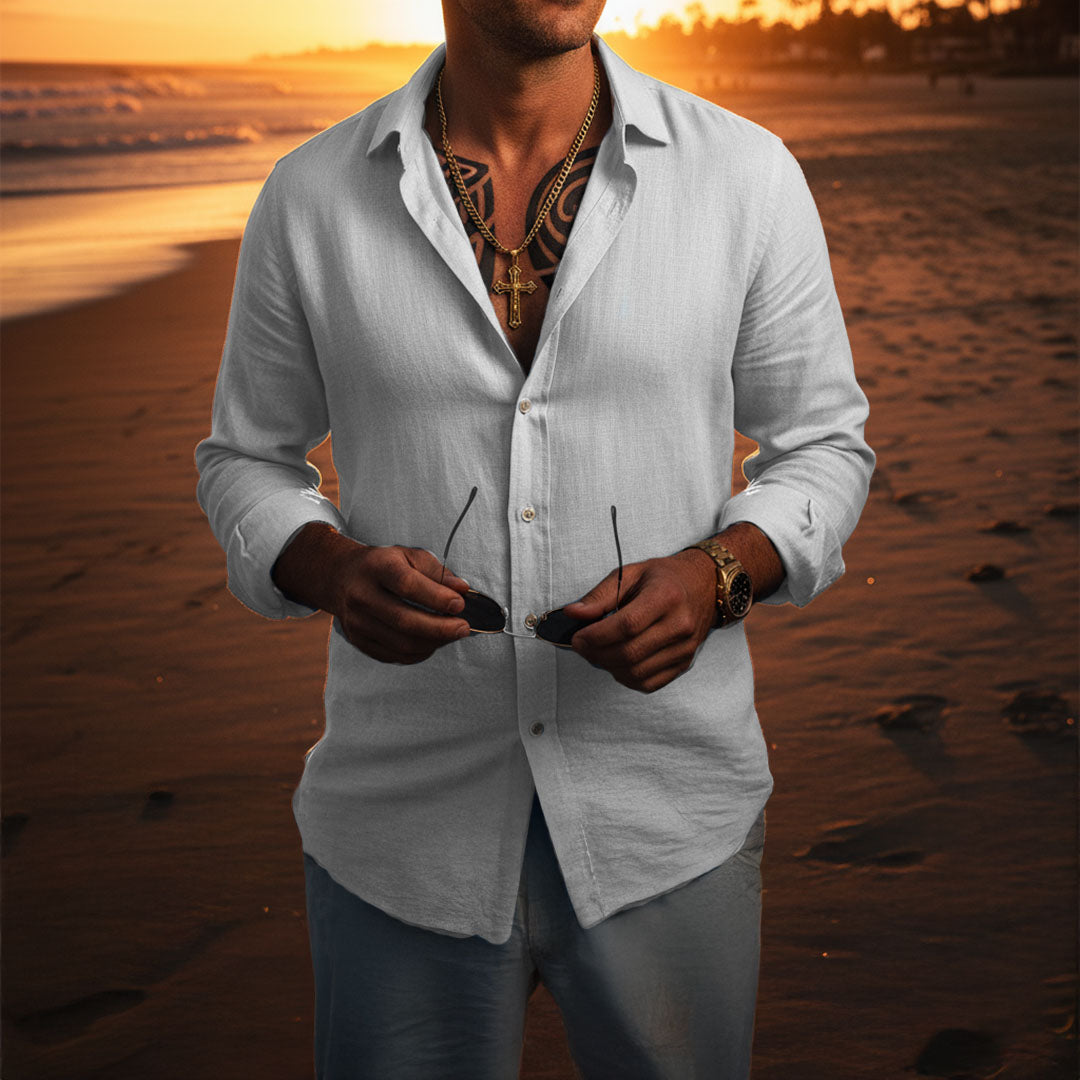 Tailored from a refined cotton-linen blend, this handsome shirt brings together relaxed comfort and polished detail. Its lightweight weave moves effortlessly with the body, while the open collar and smooth drape capture laid-back sophistication. A versatile essential designed for evenings by the coast or upscale casual settings.