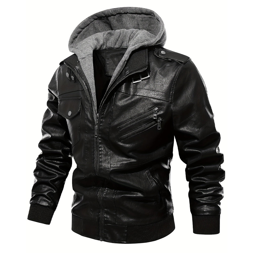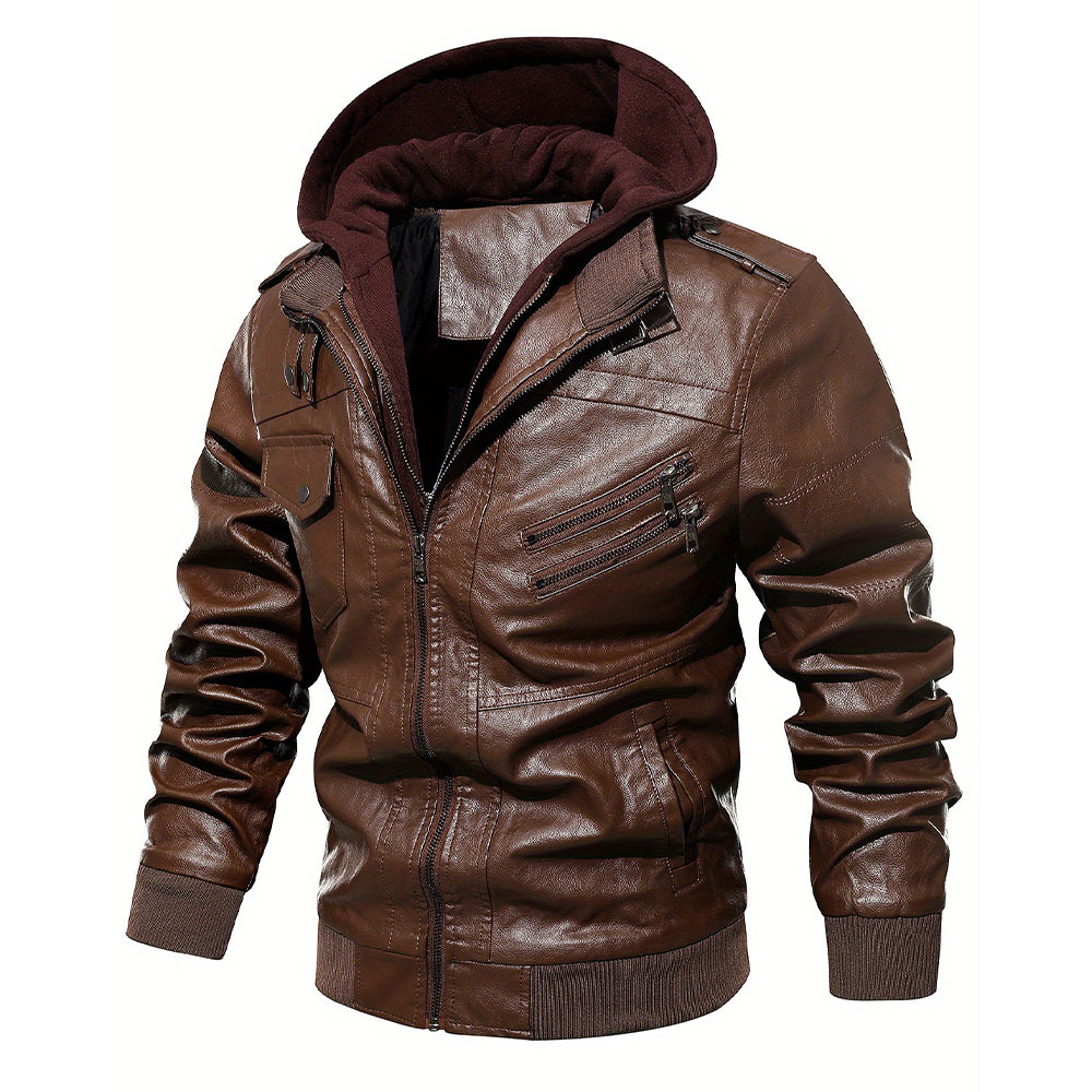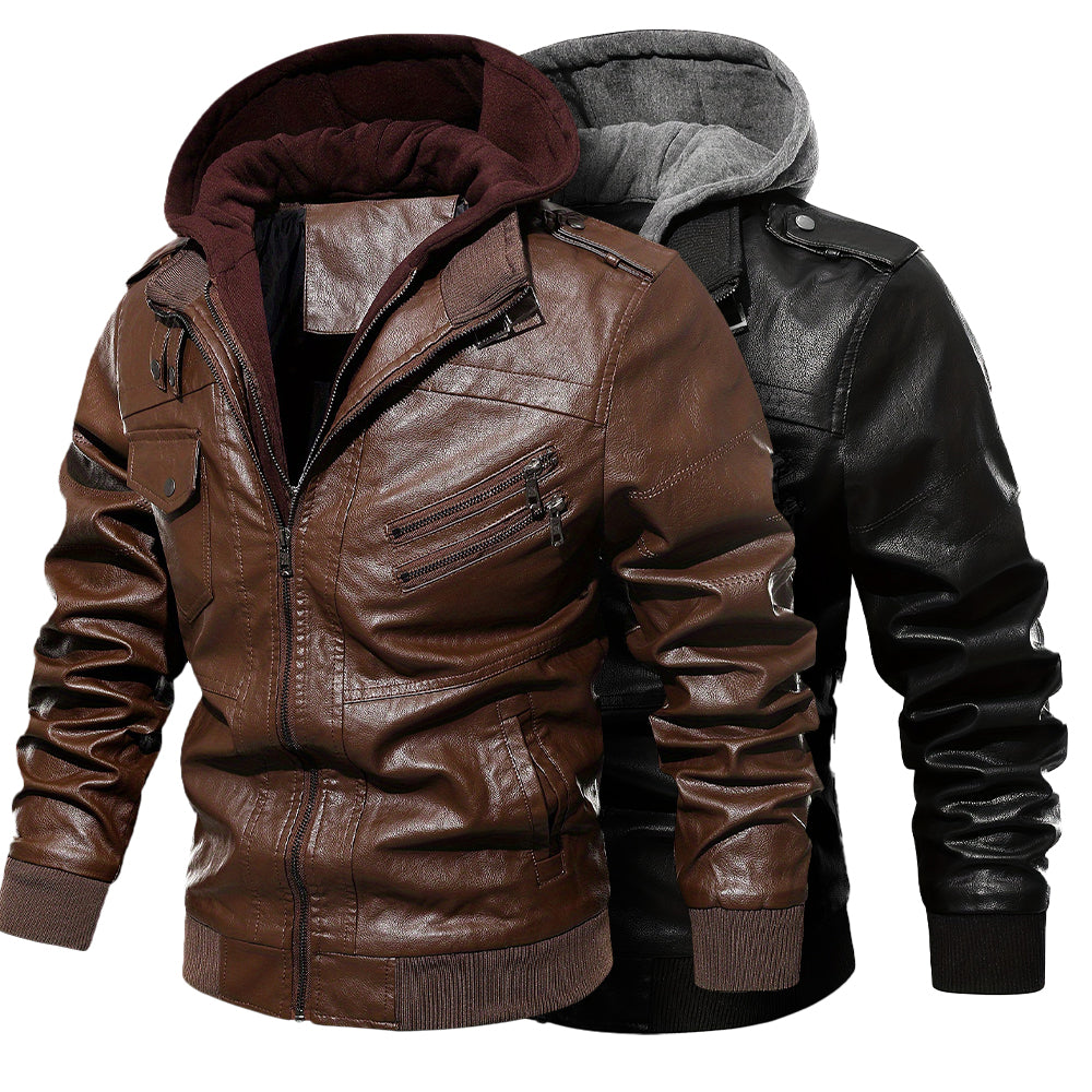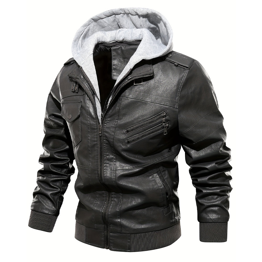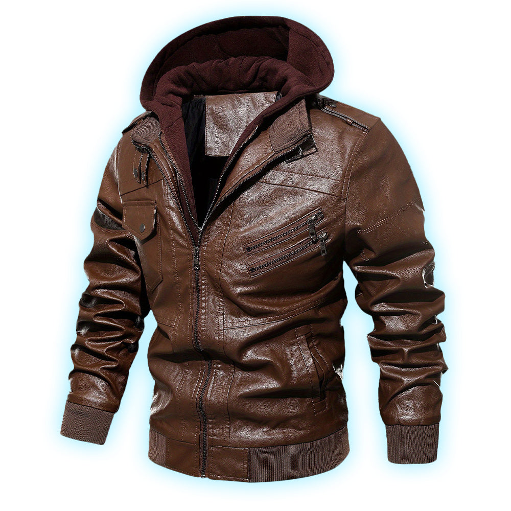 Skillfully tailored with contemporary stitching and a classic style, this leather jacket features a smooth leather exterior that will endure for many years. An adaptable hoodie with adjustable drawstrings adds convenience, and ribbed cuffs and hem provide a customized fit.
