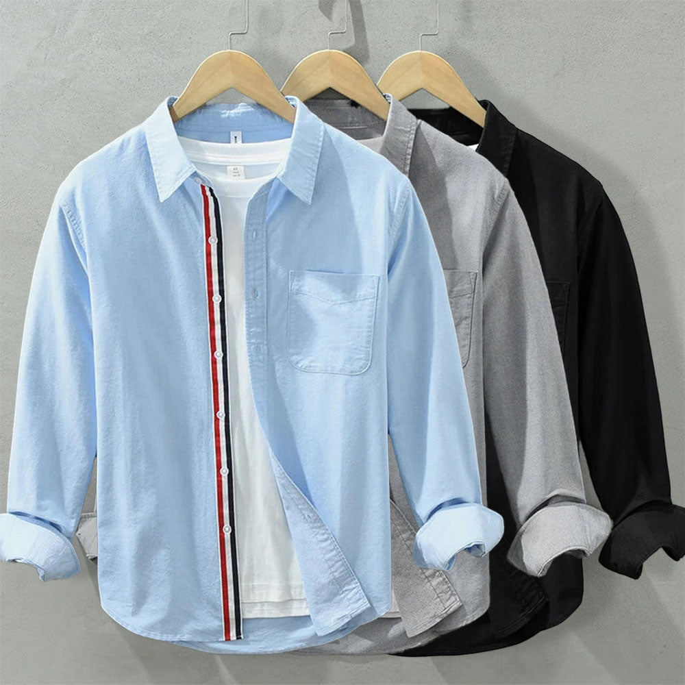 Tailored for standout simplicity, this crisp everyday shirt blends minimal design with a bold accent, featuring a sleek contrast stripe along the placket. A laid-back essential that adds just the right edge to the daily rotation.