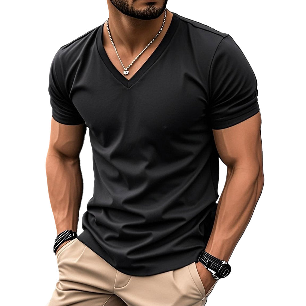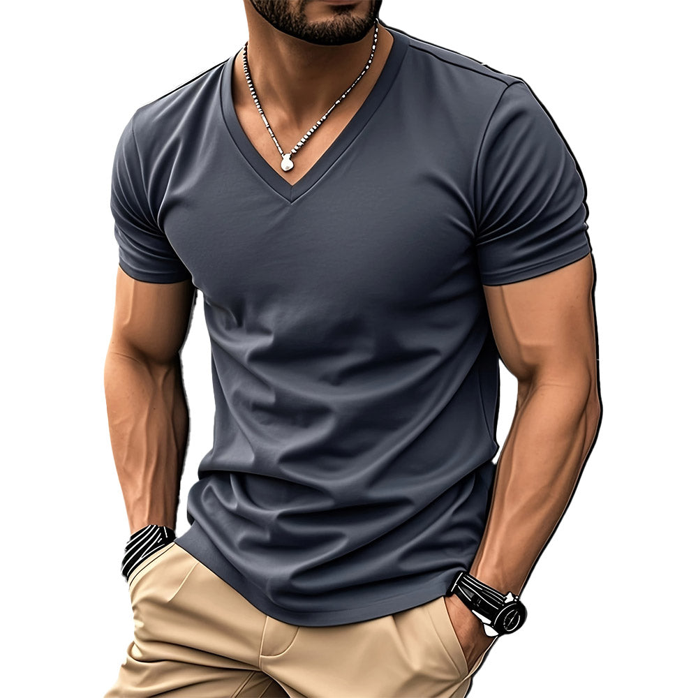 Tailored in a smooth stretch fabric blend, this smart V-neck shirt flatters the form with a clean silhouette and laid-back charm, a staple for warm days with edge.